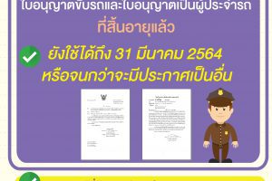 ใบขับขี่ที่สิ้นอายุแล้วยังใช้ได้ถึง 31 มีนาคม 2564 หรือจนกว่าจะมีประกาศเป็นอย่างอื่น เพื่อบรรเทาความเดือดร้อนให้ผู้ขับขี่รถและผู้ประกอบการขนส่ง