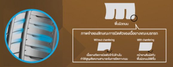 การทำงาน : ด้วยการปรับความโค้งมนของสันปลายร่องดอกยาง ส่งผลให้แรงกดที่บริเวณร่องดอกยางเพิ่มขึ้น จึงช่วยให้การยึดเกาะบนพื้นถนนดียิ่งขึ้น