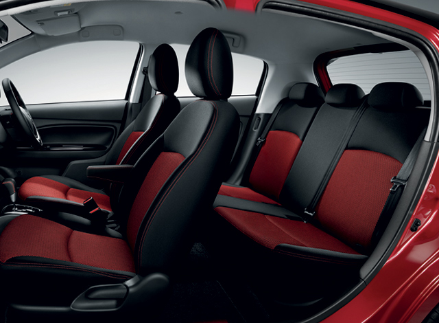 MITSUBISHI MIRAGE 2018 ภายในเรามาดูความโดดเด่นที่เหนือกว่าของรุ่น Limited กันเลยดีกว่ากับการใช้สี 2 โทน แทรกความสปอร์ตลงไปในเบาะธรรมดาด้วยการใส่สีแดง เข้าไปทั้งด้ายที่เดินเย็บตัวเบาะ และเพิ่มพื้นผิวสีแดงแทรงลงไป เรียกได้ว่าสปอร์ตมากกว่าเก่าเยอะเลยทีเดียว